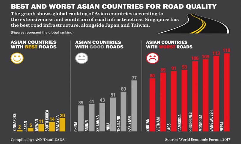 यसैगरी राम्रा सडक भएको देशहरुको सूचीमा चीन पहिलो स्थानमा छ । त्यसपछि क्रमशः ब्रुनाई, श्रीलंका, भारत, थाइल्याण्ड र पाकिस्तान छन् ।