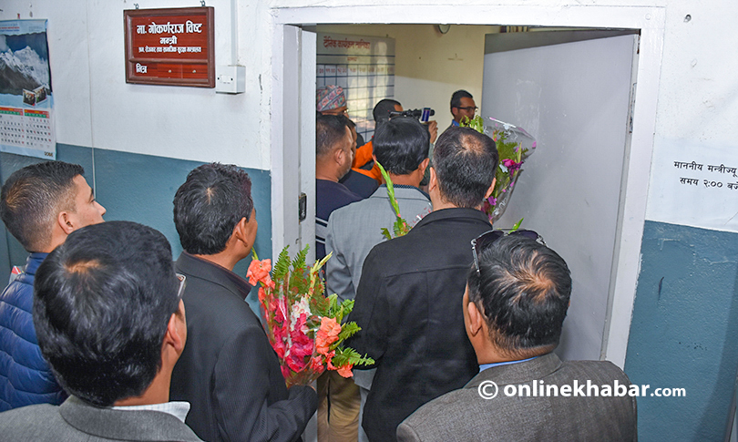 उता श्रम तथा रोजगारमन्त्री गोकर्ण विष्टको कार्यकक्षमा मेला बजारजस्तै भीड लागेको थियो । त्यहाँ बुके र सीसाको फ्रेमसहितको उपहार बोकेर मन्त्रीलाई शुभकामना दिन जानेमा कर्मचारीका साथै एमाले कार्यकर्तासमेत देखिन्थे ।